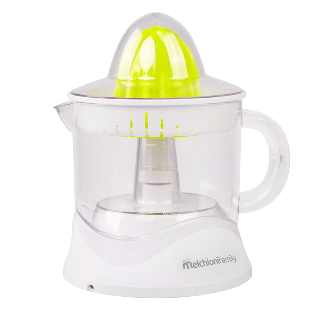 The ZUMO NEW electric citrus juicer from Melchioni Family is designed to offer ease and convenience of use thanks to its automatic pressure activation and dual rotational movement, which ensure effective juice extraction from citrus fruits of various sizes. The removable container has a capacity of 0.70 litres and is washable, making cleaning quick and easy after each use. Equipped with a 40-watt motor and standard 220-240V 50/60Hz power supply, this juicer is safe and reliable, thanks to the overheating protection system. The practical 87-centimetre cable winder allows for tidy storage of the device, making it ideal for everyday kitchen use. Its compact design and white colour easily fit into any home environment.