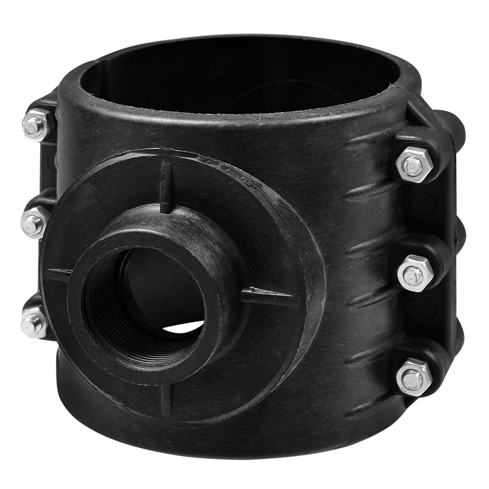 Clamp Saddle of PP 140mm with gate 1-1/2" used widely today in European for making drinking water from main lines. Clamp Saddle Ø 140x1-1/2" with female gate caught with main line pipe mechanically with bolts, for joining the fillet recommend tu use teflon. Manufactured with European standards, resistant to corrosive materials designed to withstand pressure up to 10 Bar.