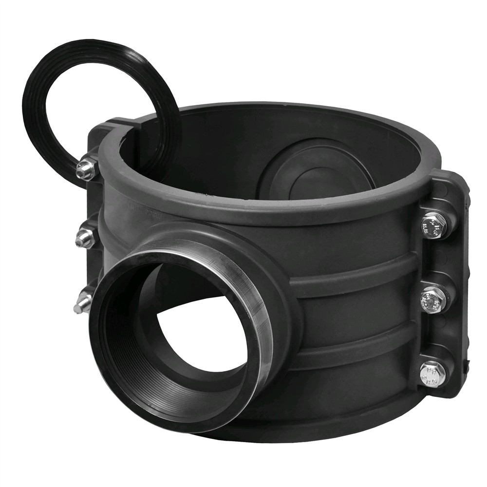 Clamp Saddle of PP 250mm with gate 4" used widely today in European for making drinking water from main lines. Clamp Saddle Ø 250x4" with female gate caught with main line pipe mechanically with bolts, for joining the fillet recommend tu use teflon. Manufactured with European standards, resistant to corrosive materials designed to withstand pressure up to 18 Bar.