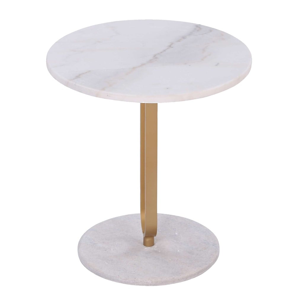 End table, with a support structure made of metal material, with dimensions of 3x1 cm and height of 54.5 cm, with powder coating made of non-liquid thermoplastic polymer paint, in golden color. The table is equipped with round-shaped table top and base, made of marble stone material, with a diameter of 50 cm, in white color. It can be used as a functional and decorative piece of furniture in decorating indoor environments of houses, hotel lobbies or indoor and outdoor environments of bars and cafés.