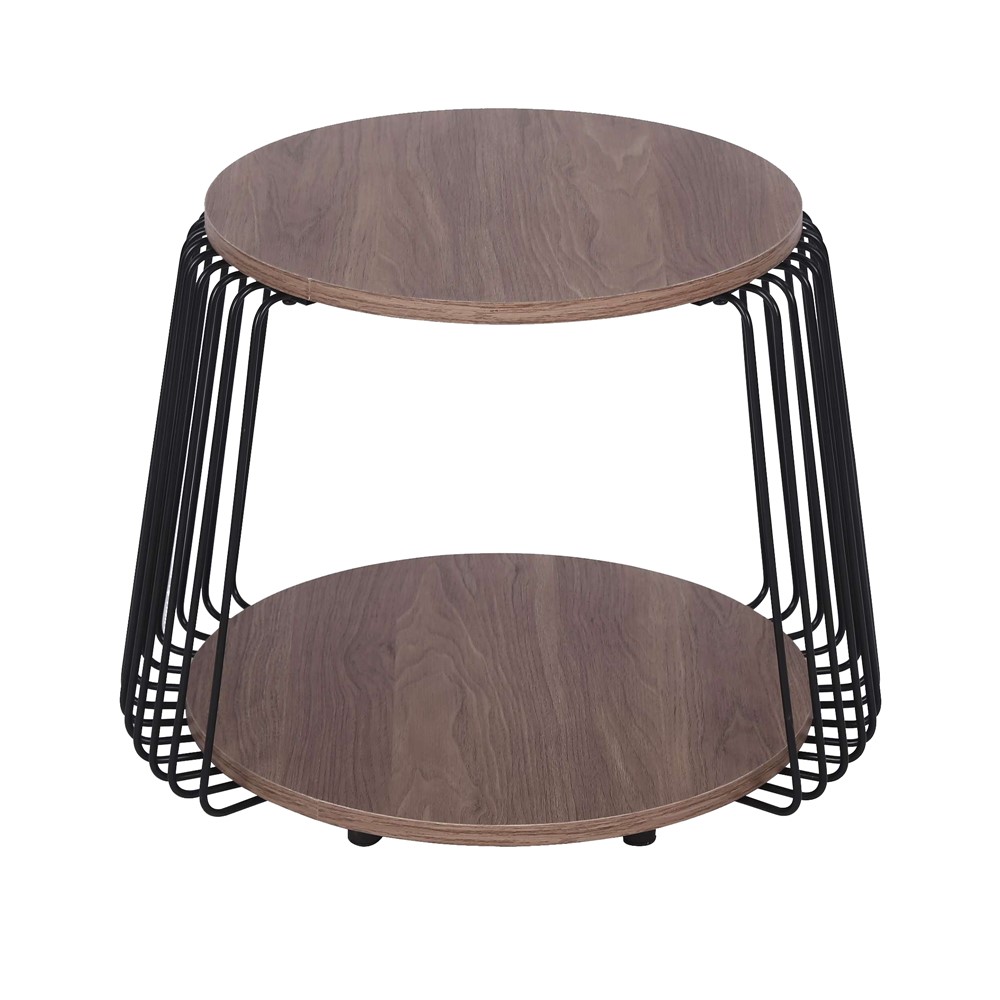 End table, with a support structure made of metallic rods, with a diameter of 0.6 cm and length of 46.5 cm, in black color. The table is equipped with round-shaped table top and base, made of MDF material as a core panel, bonded with wood veneer, with a thickness of 1.8 cm and a diameter 40 cm, in wood color. It can be used as a functional and decorative piece of furniture in decorating indoor environments of houses, living rooms and hotel lobbies. This product is suitable for use with the coffee table with the same design, code 242262.