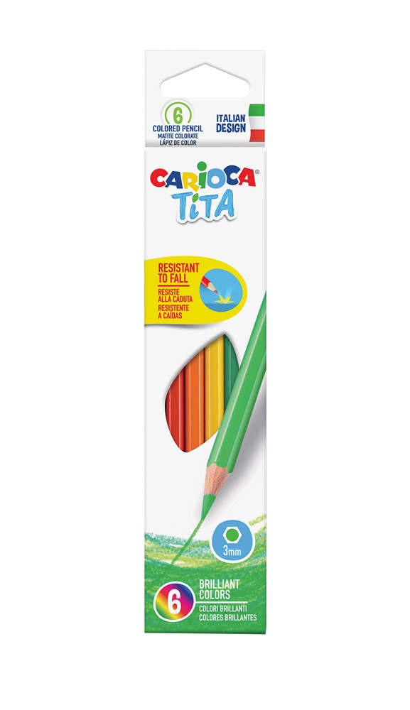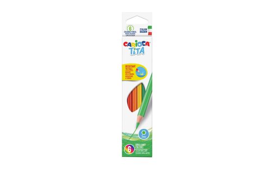 Colored pencils for children, which are made of synthetic resin material, without toxic content, in 6 different colors, equipped with a reinforced tip, that resists the pressure exerted by children's hands during coloring and with a hexagonal-shaped structure, that gives them ergonomic properties and makes them easy to use. The pencils are used for coloring, drawing or other artistic works, in schools and kindergartens. This product is suitable for use by children over 3 years old.