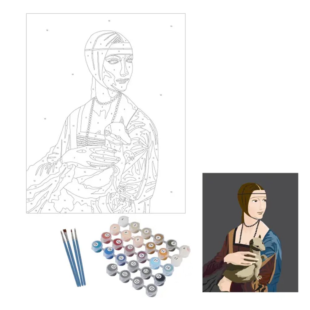 This coloring set inspired by the famous work of "Lady with an Ermine" offers the opportunity to create a copy of the famous work, using the coloring by numbers technique. With a size of 40x50 cm, this set is ideal for those who want to explore this unique style and color one of the most famous paintings in the world. The set contains everything you need to create a perfect copy: high-quality paint, a suitable frame and a detailed guide that guides every step of the coloring process. This set is a great opportunity for young artists and art enthusiasts to create a wonderful work of art that will attract attention.