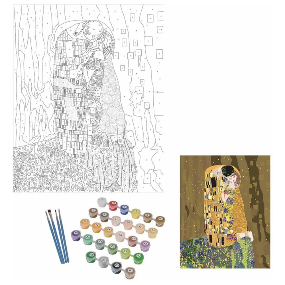 This coloring set inspired by the famous work of "The Kiss" offers the opportunity to create a copy of the famous work, using the coloring by numbers technique. With a size of 40x50 cm, this set is ideal for those who want to explore this unique style and color one of the most famous paintings in the world. The set contains everything you need to create a perfect copy: high-quality paint, a suitable frame and a detailed guide that guides every step of the coloring process. This set is a great opportunity for young artists and art enthusiasts to create a wonderful work of art that will attract attention.