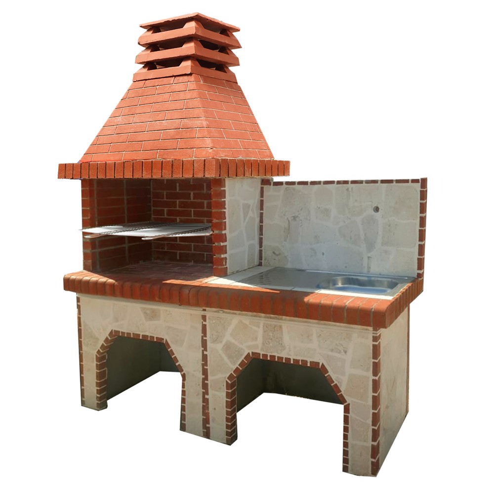 Concrete barbecue with stone decor and sink, 215x185x60 cm. Built of concrete and treated with refractory solution. Equipped with height positions to place the baking rack. Designed with space to position various barbecue accessories and equipped with counter and sink. The chimney lift block is not included. Assembly required.