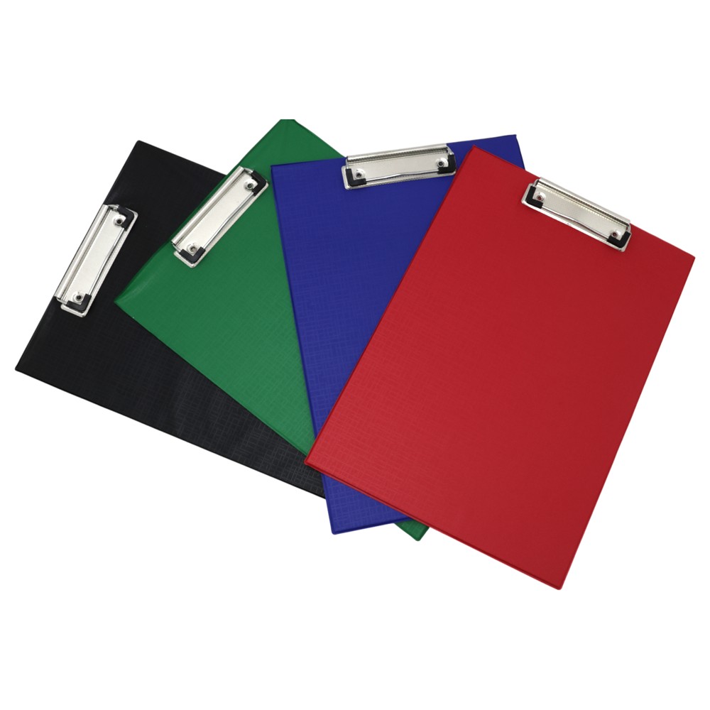 Conference folder, made of cardboard, equipped with metal clips for placing sheets. Used to keep various documents organized, in meetings, conferences or presentations.