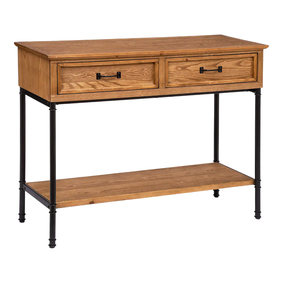 Furniture for the living room or for any other area of the house you want in brown color and classic style. There are 2 drawers and 1 shelf to store and organize your things. It is made of wood, fir and mdf. Its frame is metallic in black, as are the handles it has to open the drawers. The height between the shelves is 43 cm. The product comes unassembled and is assembled according to the instructions on the packaging.