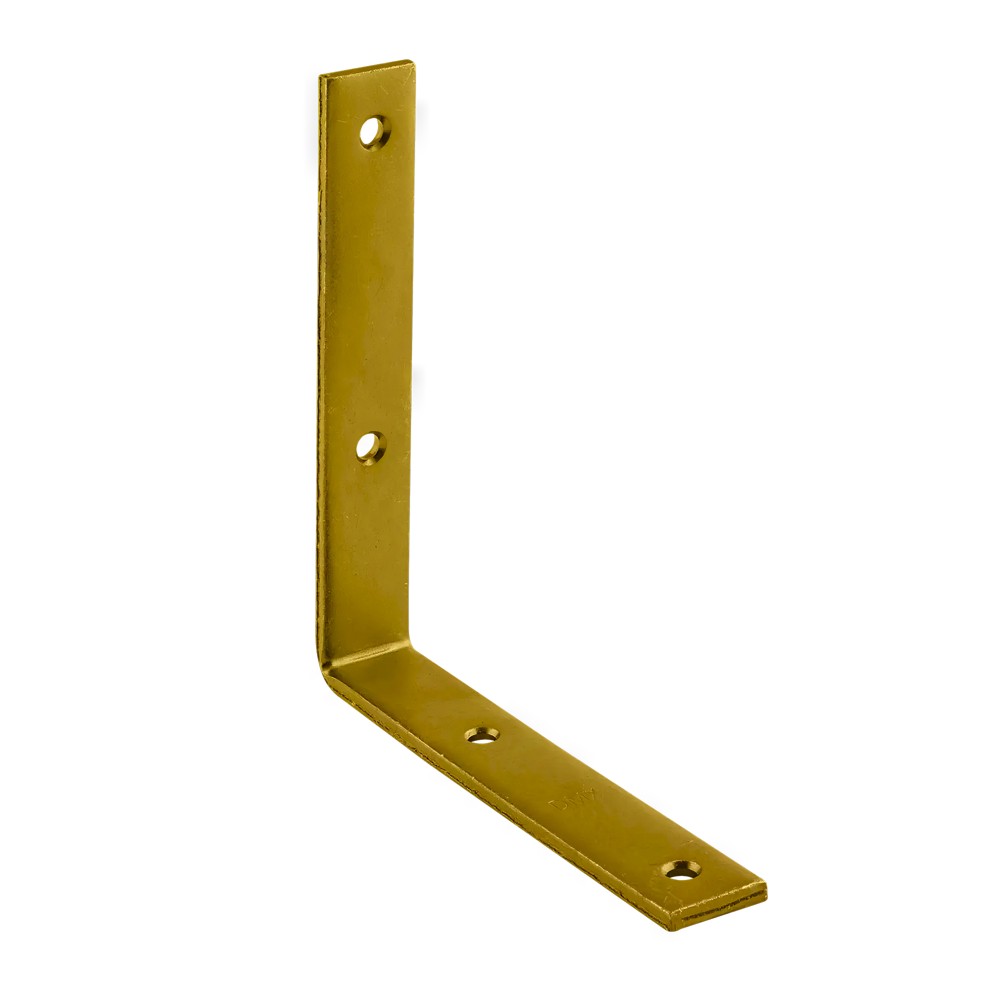 Angled wood connector, made of galvanized zinc material, measuring 150x150x25x5 mm, in gold color, equipped with an external coating of zinc powder, which protects it against corrosion and rust. It is used to enable the best possible connection of wooden elements to each other or wooden elements to walls and floors. This product is suitable for use in both standard systems and for individually designed connectors.
