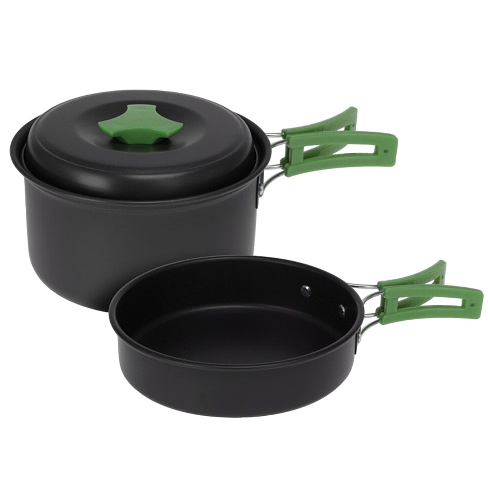 Cooking utensils for camping, made of aluminum material with stainless steel handles. The package contains 1 pot with lid measuring 14x14x7cm, and 1 pot measuring 15x15x4cm.