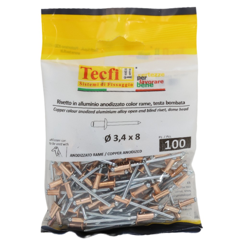 Copper anodized dome blind rivet,al/zp steel, Ø 3,4x8mm, Bag 100