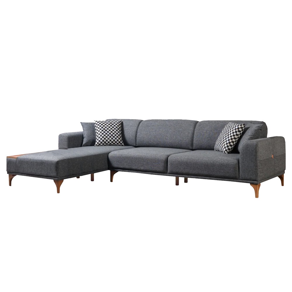Invite your friends and family over for a movie night on the couch that offers plenty of space and style. The contemporary design of the sofa which features arms on one side, a high back, a sleek silhouette and is led by the left arm. On its side there is a wooden corner where you can charge your phone or place your coffee cup while watching TV.