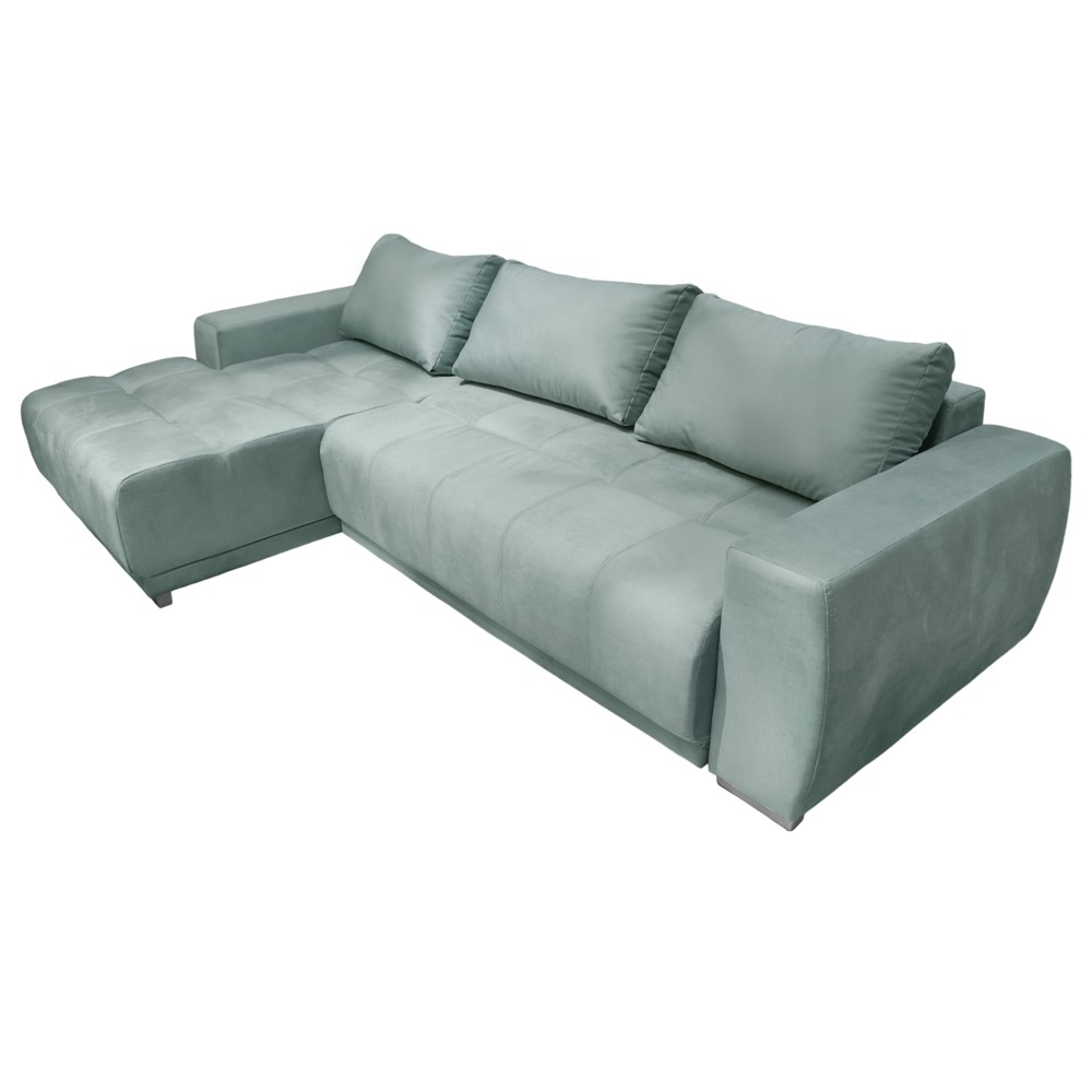 Corner sofa, with canape on the left side, with measurements of 280x204x66(87) cm, with textile upholstery, in taupe green color. The supporting structure is composed of durable beech and spruce wood bars, as well as melamine material, without formaldehyde content. The medium-soft inner padding consists of foam material, PVC free, with reinforcing steel springs and static chrome legs. The sofa seat can be opened allowing it to turn into a bed, with a surface area of 230x130 cm. The upholstery material is stain resistant and can be easily cleaned with a damp cloth. The minimalistic and functional design makes this product an optimal choice for your interior environments.