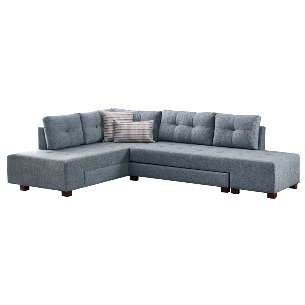 Corner sofa, Manama, left, wooden frame, textile upholstery, plastic legs, bed opsion, blue