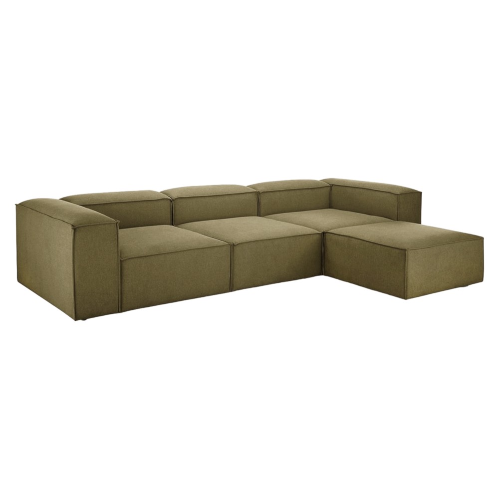Corner sofa of the Relax line, with 4 modules which include 2 corner modules, 1 middle module and one puff module. The inner support structure is composed of kiln-dried hornbeam wood, with soft polyurethane foam filling, with a density of 30 DNS, and linen fabric upholstery. The internal area of each of the modules is 80x80 cm, while the supporting part of the back and arms has a height of 28 cm. The sofa's modular division and compact minimalist design allow it to be combined in 4 different ways and can easily be turned into a bed, optimizing the organization of your interior spaces. The product is available together with 6 decorative cushions included in the packaging.