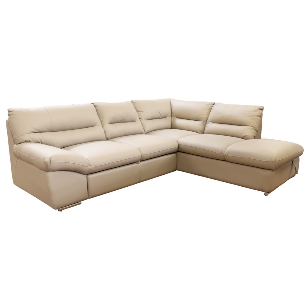 Corner sofa, with canape on the right side, with measurements of 268x216x87 cm, with polyurethane upholstery, in beige color. The supporting structure is composed of durable beech and spruce wood bars, as well as melamine material, without formaldehyde content. The medium-soft inner padding consists of foam material, PVC free, with reinforcing steel springs. The sofa is equipped with an opening storage space and static chrome legs. The sofa seat can be opened allowing it to turn into a bed, with a surface area of 183x123 cm. The upholstery material is stain resistant and can be easily cleaned with a damp cloth. The minimalistic and functional design makes this product an optimal choice for your interior environments.
