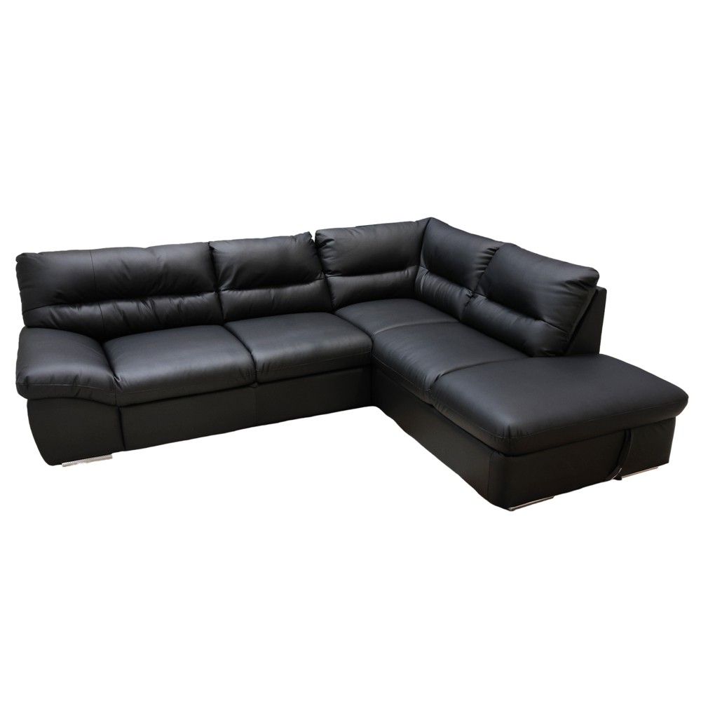 Corner sofa, with canape on the right side, with measurements of 268x216x87 cm, with polyurethane upholstery, in black color. The supporting structure is composed of durable beech and spruce wood bars, as well as melamine material, without formaldehyde content. The medium-soft inner padding consists of foam material, PVC free, with reinforcing steel springs. The sofa is equipped with an opening storage space and static chrome legs. The sofa seat can be opened allowing it to turn into a bed, with a surface area of 183x123 cm. The upholstery material is stain resistant and can be easily cleaned with a damp cloth. The minimalistic and functional design makes this product an optimal choice for your interior environments.