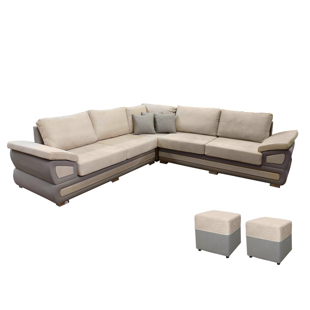 Corner sofa with stool, wooden frame, 8 cm, textile upholstery, beige/grey, 280x280xH75 cm