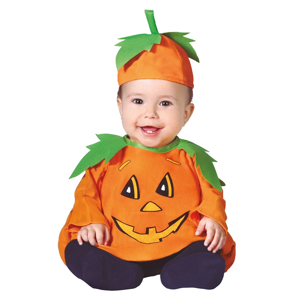 Baby suit with pumpkin cape, made of anti-allergic polyester material in orange color with green leaves. The dress consists of the cape and the hood. Suitable for ages 6-12 months with body length 80-86 cm. Black overalls are not included in the set.