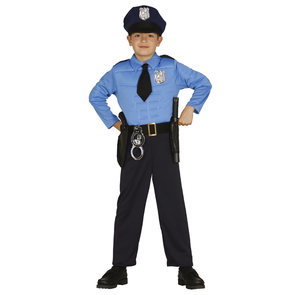 Halloween costume for men children, Polic, made of polyester material in blue and black. The police uniform comes with a beautiful belt and hat, both made of polyester, to complete the outfit, consisting of a police suit, 1 hat and 1 belt. Suitable for ages 7-9 years, with dimensions: Body length: 125-135 cm, Chest circumference: 67-70 cm, Perimeter belt: 59-60 cm, Hip circumference: 67-72 cm.