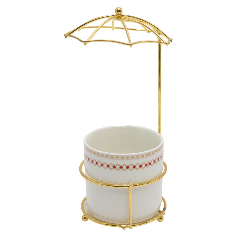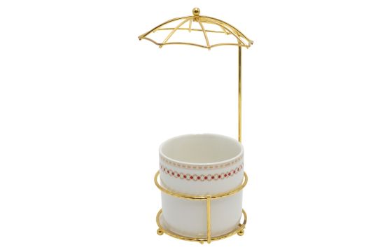 Cup with umbrella-shaped holder, glass/metal, white/gold, 8x20 cm