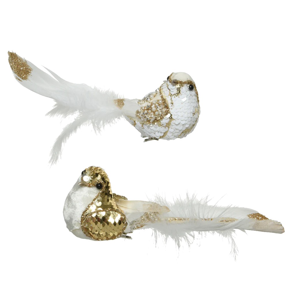 Decorative bird with catch, polyester, gold / white, 21 cm