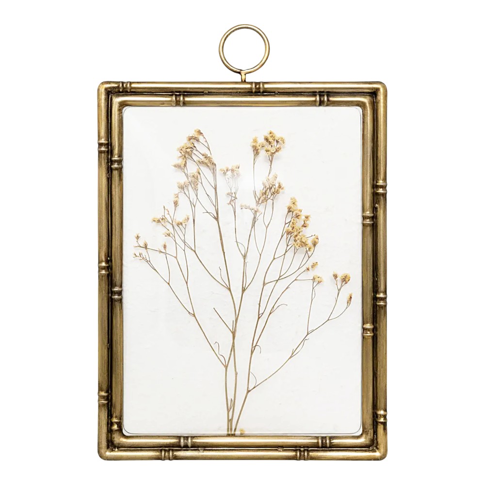 Wall frame with dried flowers in vintage style. It is made of metal material and mdf wood in golden color. The front has a curved glass. Place it on a blank wall to add character and uniquely decorate your space.