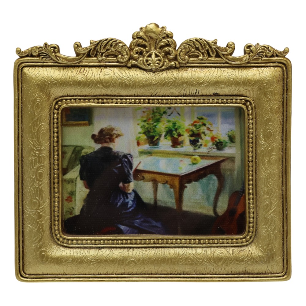 Decorative resin frame, in gold color, perfect for displaying various photos or illustrations. Measuring 11.7x11.7 cm, this frame can be placed on the wall or on a table or dresser surface. The resin material offers durability and a refined look, while the gold color brings shine and elegance, making this frame an attractive element in any environment.