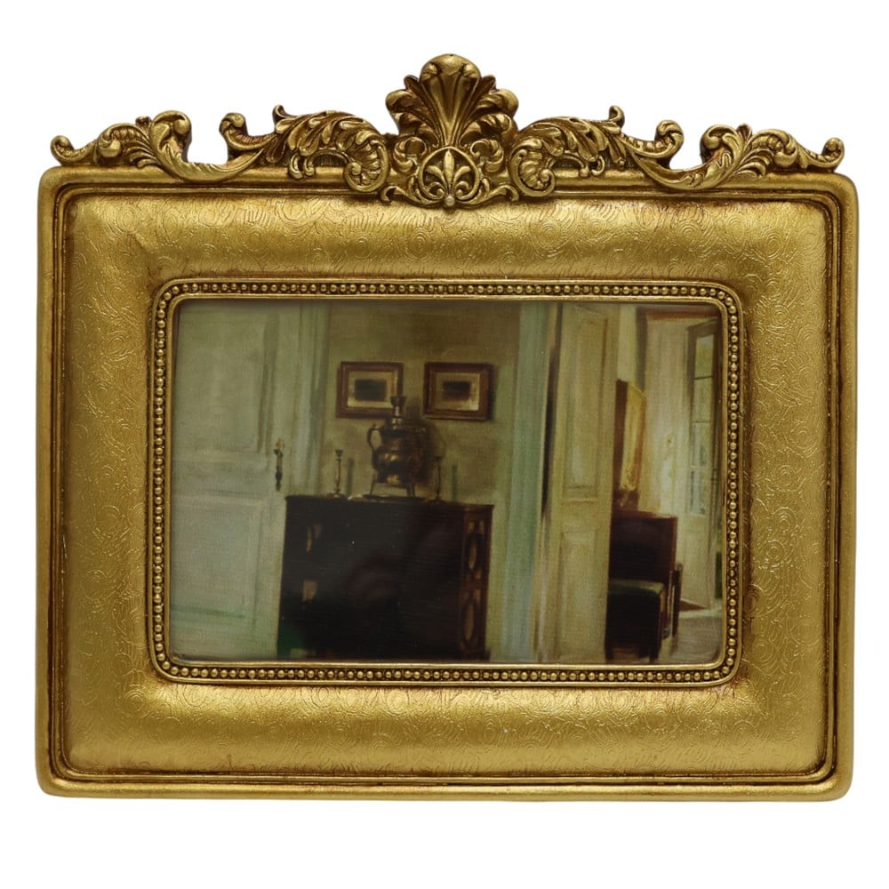 Decorative resin frame, in gold color, perfect for displaying various photos or illustrations. Measuring 20x18 cm, this frame can be placed on the wall or on a table or dresser surface. The resin material offers durability and a refined look, while the gold color brings shine and elegance, making this frame an attractive element in any environment.