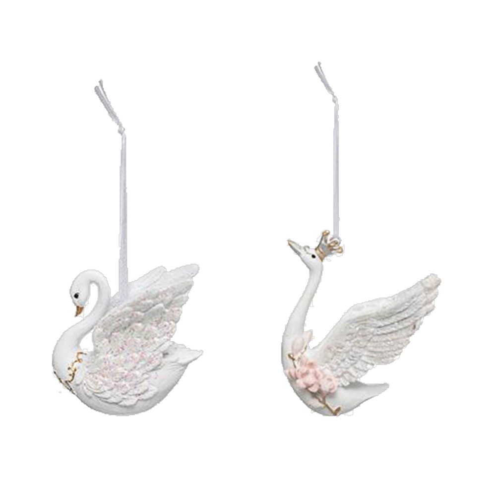 Decorative swan ornament, made of polyresin material, with dimensions of 9.5x6.7x9.9 cm, in white color, equipped with a ribbon at the upper part, which allows it to be placed as a decorative toy on the Christmas tree. It can be used to decorate various interior environments during the Christmas and New Year holidays. This product is suitable for non-professional use, in home environments, and for professional use, by event organizing companies.