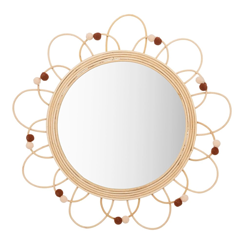 Round shaped wall mirror and pom-pom all around. It is made of rattan wood in a natural shade. The diameter of the mirror without a frame is 22 cm. Ideal for placement in children's or baby's room.