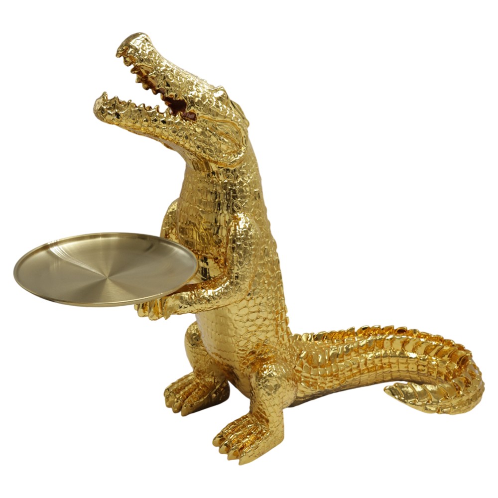 The decorative object "Crocodile", made of gold-colored resin and measuring 36xH50 cm, is a unique and luxurious accessory that brings an exotic touch and dynamism to any environment. With a stylized and detailed crocodile design, this object represents durability, making it an attractive and special element in your space. The gold color gives it shine and illumination, turning this figure into a central part of any room, creating a luxurious and modern atmosphere. The resin material is durable, easy to maintain and preserves the design details for a long time, providing a durable and refined accessory. This object is perfect for placing on consoles, center tables, shelves, or as part of a decorative composition in living rooms, foyers, offices or commercial spaces.
