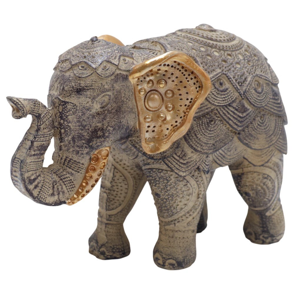 The decorative statue in the shape of an elephant is a decorative object that will add a sophisticated look to your decorations. You can use it in different spaces of shelves or even tables. It fits very well with oriental style decors and has a perfect combination of colors that gives the idea of ​​an antique decorative object. It comes with a golden color in some parts of it, which adds a luxurious touch. Decorate your spaces with taste and class thanks to this object that connects you directly with nature. It comes made of resin material and in dimensions 16x7xH11 cm.