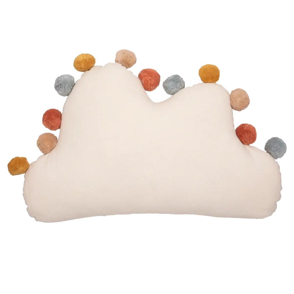 Decorative pillow in the shape of a cloud with multicolored pompoms. The pillow has a size of 30x50 cm, and is filled with a soft filter. Ideal decoration for every room.