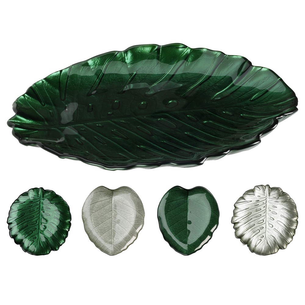 Decorative serving plate in various leaf shapes. Adapted to serve cakes, dried fruits and others.