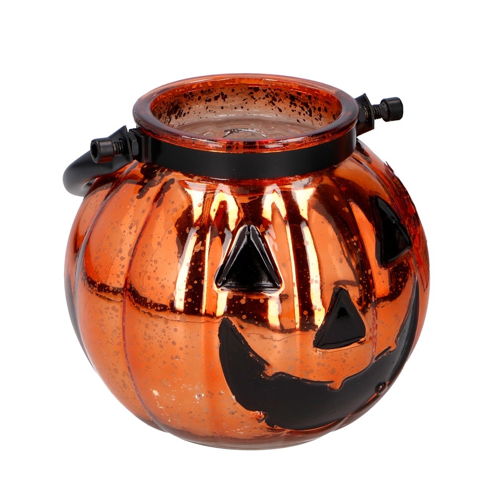 Pumpkin-shaped decorative light for Halloween, made of translucent glass material, in orange and black color. The lamp is equipped with a metal carry handle and 10 LED lights, which operate with 2 AA batteries, which are not included in the package. This lamp can be used for indoor and outdoor environments decoration during the Halloween holiday. This product is suitable for use in non-professional environments, such are homes, schools, etc., and professional environments, such are businesses, hotels, restaurants, bars, etc.