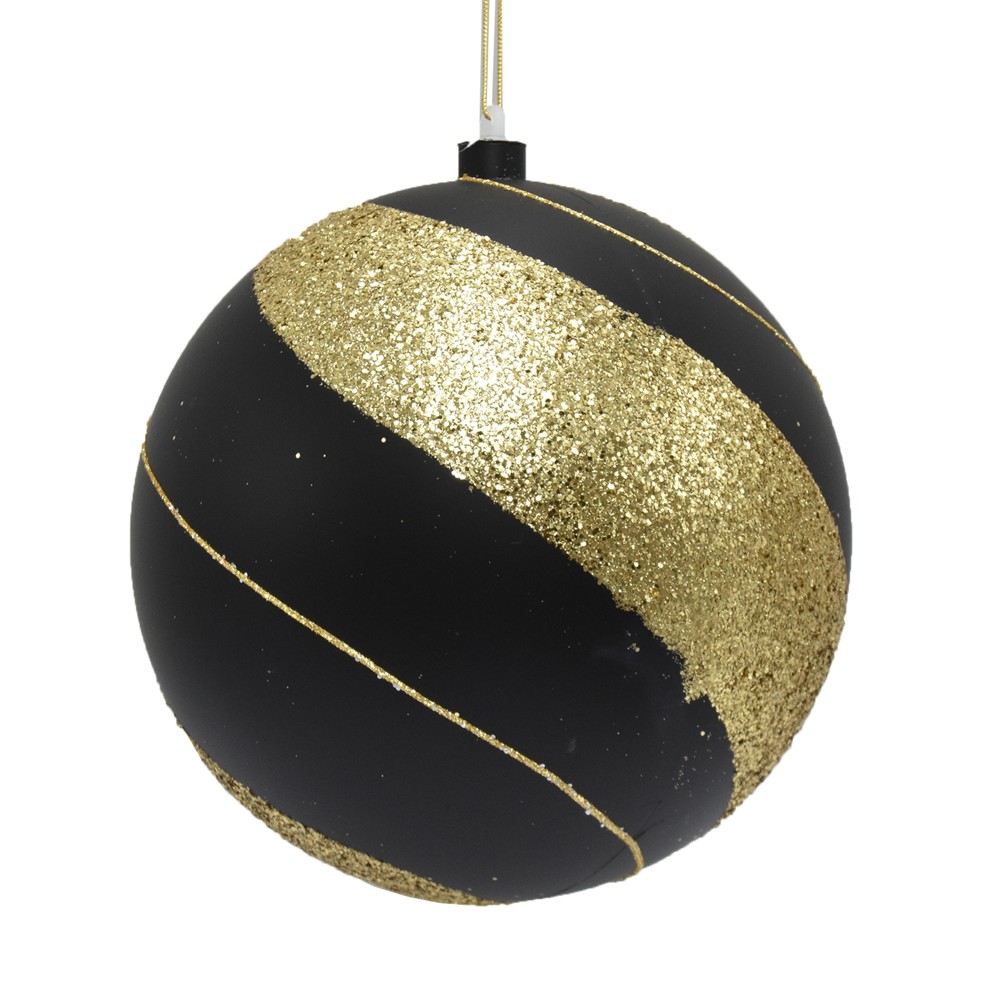 Beautifully decorate your New Year's Tree with this sphere of black and gold color. The plastic material is of high quality and very resistant to shocks. Bright colors and attention to detail. Very good quality at a competitive price.
