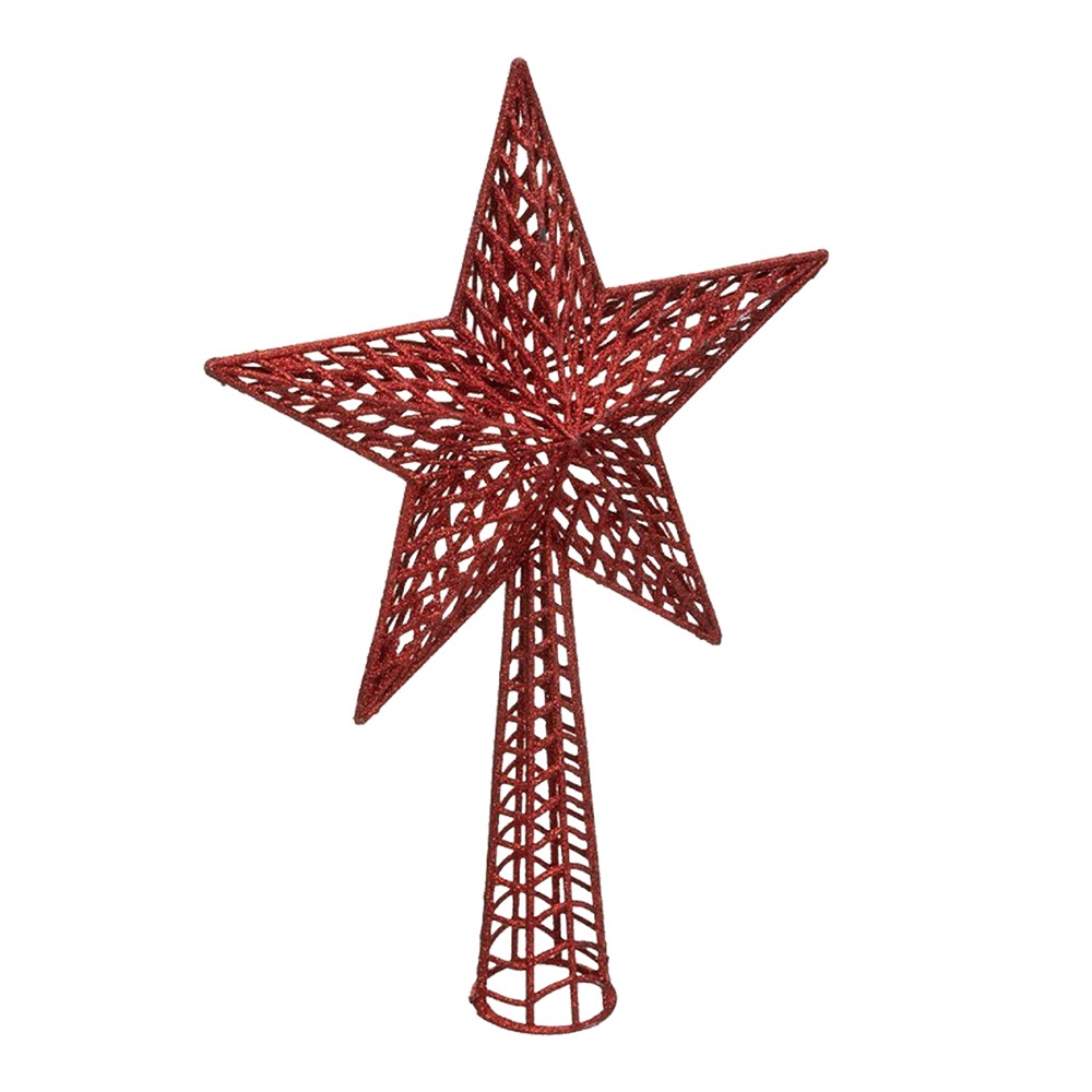 Decorative Christmas star, made of plastic material, with dimensions of 27x38 cm, in glittery red color, which can be used to decorate the crest of the Christmas tree. It can be used to decorate various interior environments during the Christmas and New Year holidays. This product is suitable for non-professional use, in home environments, and for professional use, by event organizing companies.