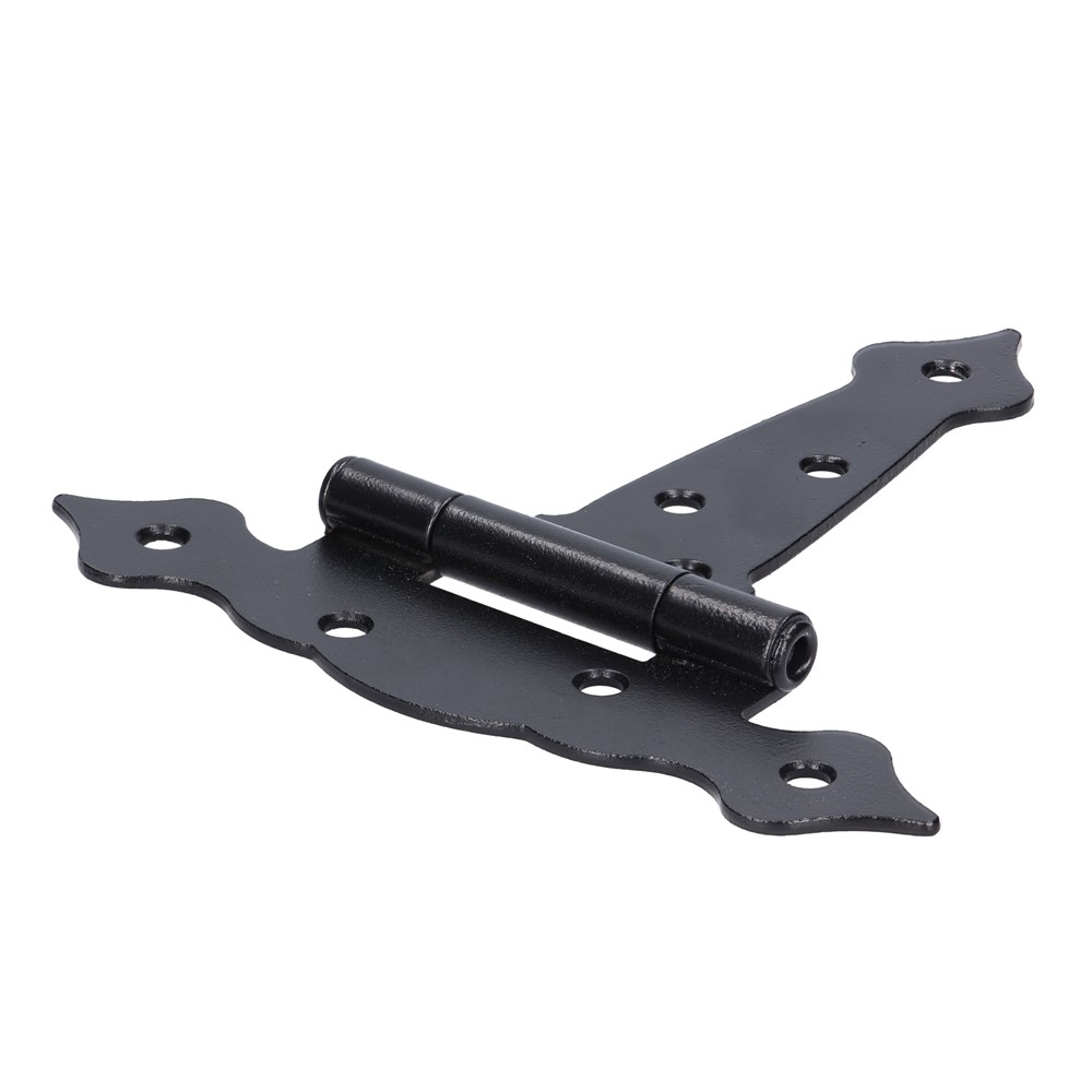Decorative T-shaped hinge, made of galvanized zinc material, with Duplex coating layer, with dimensions of 12.5x4x16x0.25 cm, in black color. The constituent material is resistant to use, heavy weights, rust or abrasion. It can be used for mounting the small doors, outdoor gates of the fences, chests and for other uses.