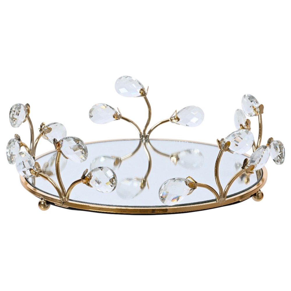 This decorative glass tray combines elegance with a luxurious style, thanks to its gold colored details and ornamental elements. With dimensions of Dia.28.5xH10.5 cm, it serves as a stunning centerpiece in any space, whether placed on a table, dresser, or in a decorative display. The gold toned metal frame adds a sophisticated look, while the delicate design brings an extra touch of sparkle and refinement. Perfect for displaying accessories, candles, perfumes, or simply as a decorative accent piece.