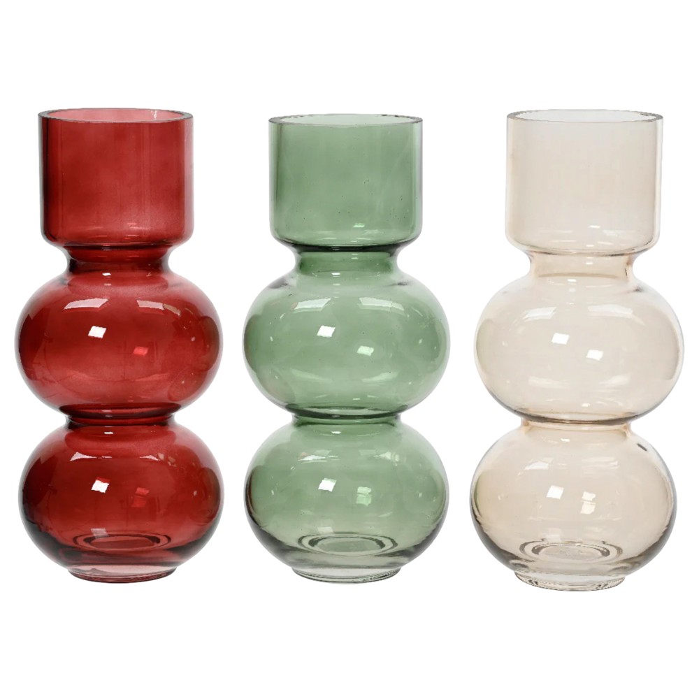 These decorative glass vases come in three elegant colors: red, green, and white, offering a stylish choice for various interior styles. Measuring Dia.12xH27 cm, they feature a modern silhouette with two rounded bulb shapes that create a unique and eye-catching design. Perfect as a centerpiece on a table or as a decorative element on shelves and consoles, these vases bring color, elegance, and style to any space.