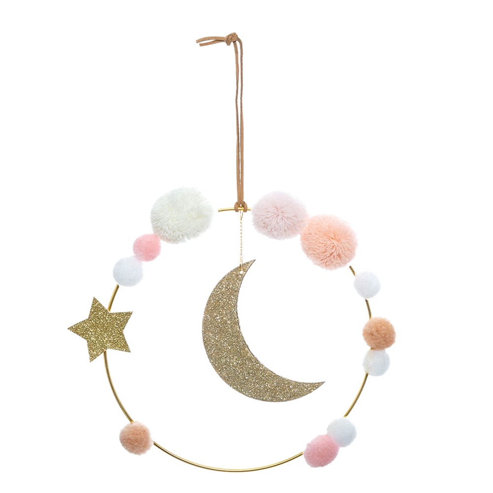 Round Pompon Decorator. The decorator is made of metallic material. With textile pompom decor. Ideal for decorating children's rooms. The decorator can be hung or can be placed somewhere.