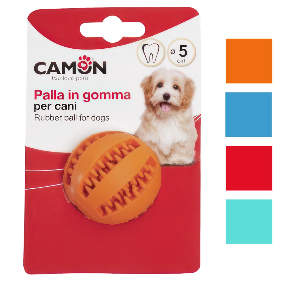 Rubber toy available in different colours: red and orange. This dual-purpose item will let your dog rub and massage their gums while playing along!