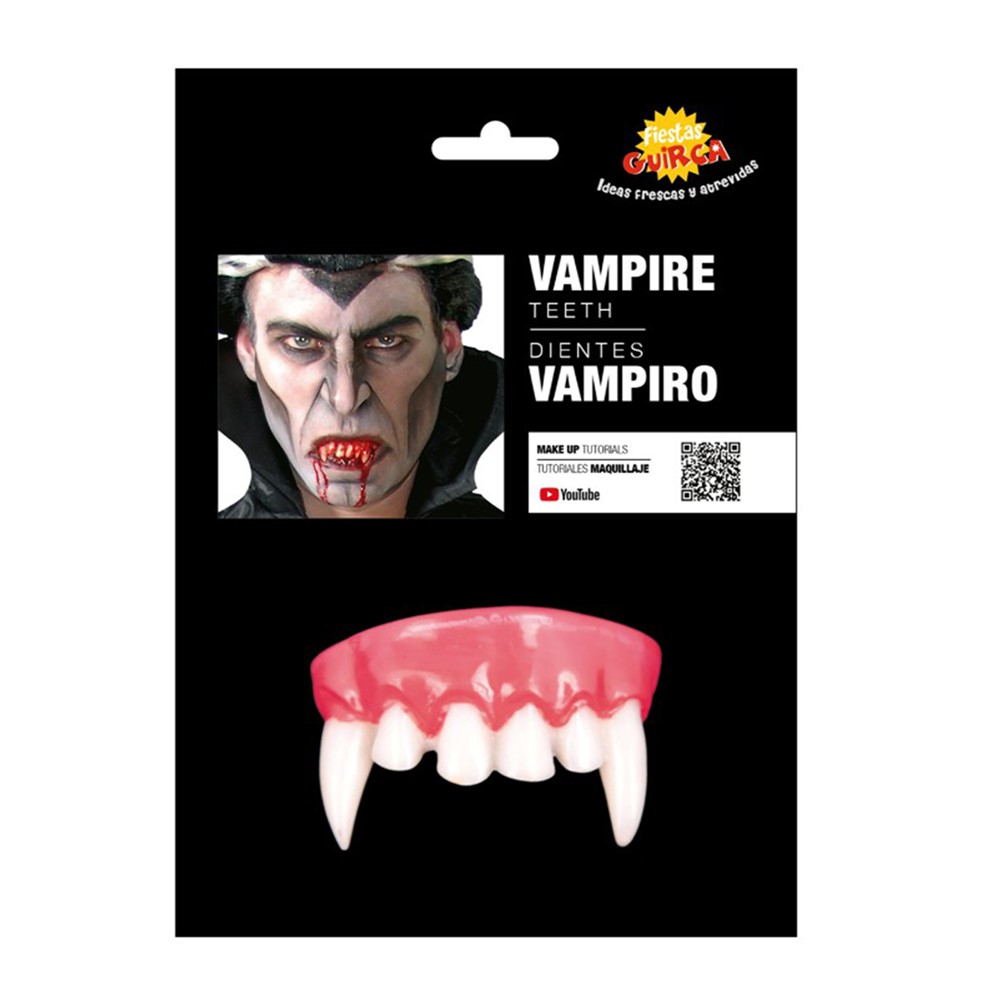 Vampire teeth, made of non-toxic plastic material. Used to be placed in the mouth giving the effect of a vampire. It is ideal to be used with vapir dresses creating a natural effect.