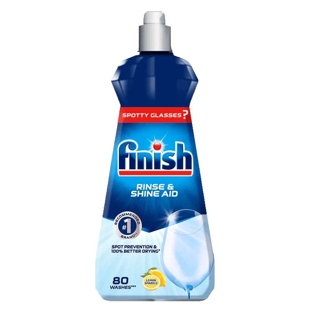 Finish Rinse & Shine Aid detergent when washing in the dishwasher, provides brighter and drier dishes, eliminates rinse residue, faster drying time, reduces water spots, provides shine to dishes.