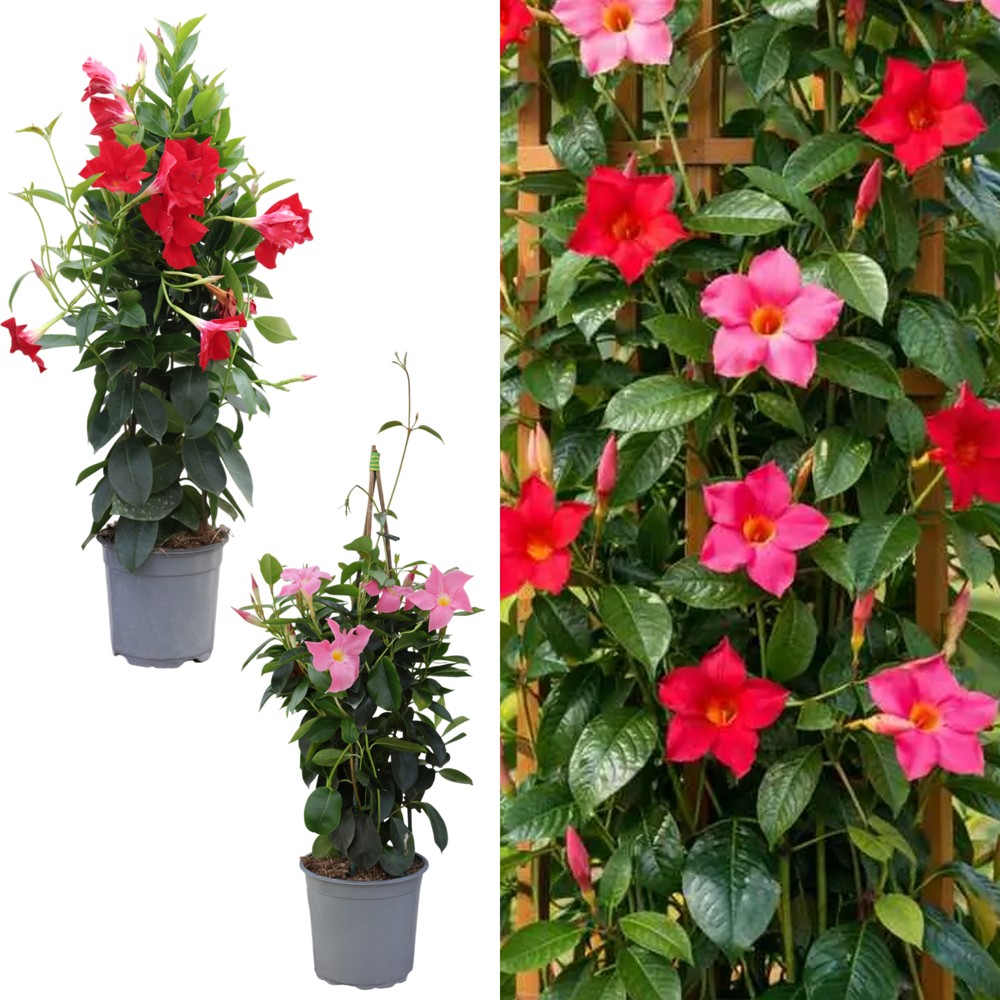 The plants thrive in summer but have to be moved indoors in the cooler season. The plant is similar to mandevilla and works outside in warm zones, or indoors as an accent houseplant. Dipladenia is a bushy plant whose stems grow and hang down. The plants have trumpet-shaped flowers with bright colors, but they have a larger flower usually in red, pink. Plants need bright light. The leaves are fine and the flowers beautiful in a wide range of colors.