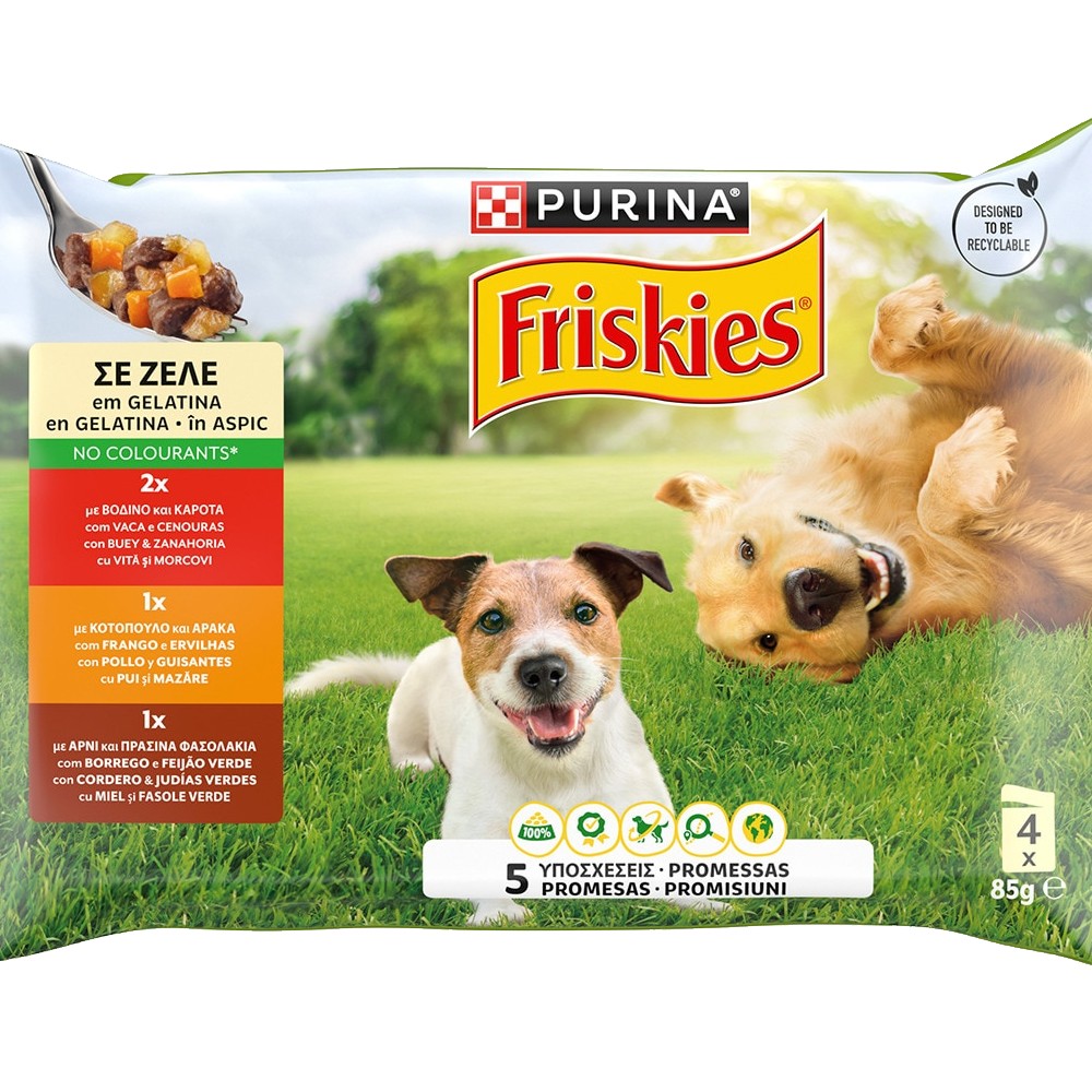 Dog Snack, Friskies, Dog Adult, 4x85 g, 2 with beef and carrot, 1 with chicken and 1 with lamb and peas