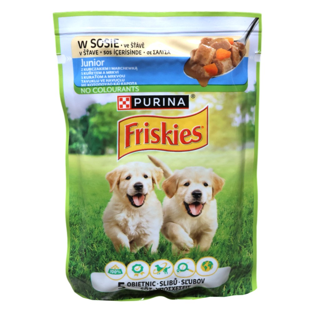 Friskies Dog Junior Snack, in a 85 gram pack, is the ideal choice for puppies in their growing phase. Made with delicious chicken and carrot, this food offers a balanced combination of taste and essential nutrients for your puppy’s healthy development. Soft and easy to chew, this snack is suitable as a reward during training or as a tasty treat between meals. With careful composition and a taste that puppies adore, Friskies Dog Junior helps build a strong start in life.