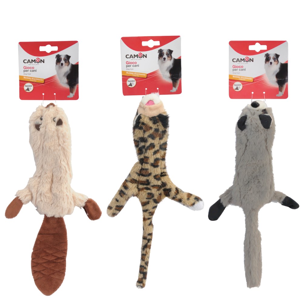 Funny polyester dog toys, in the shape of 3 animals (tiger, squirrel and skunk). Equipped with internal squeaker. Available in 2 different sizes.