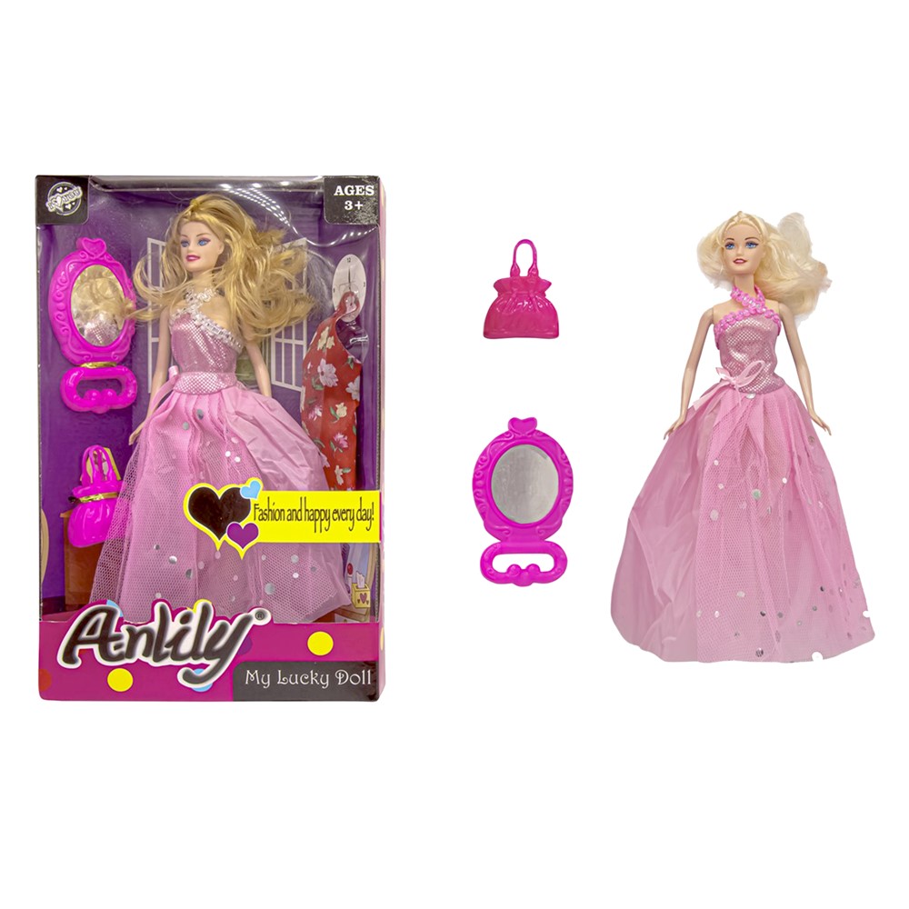 Toy set for girls, which includes a doll, a dress, a mirror and a bag, made of plastic material, in pink color. This set helps to develop the imagination, stimulates the development of the sensory skills and the development of learning skills in children, through role play. The constituent material and paint have no content that can be toxic or harmful for children and the product is certified for safety in use. This product is suitable for use by children over 3 years old.
