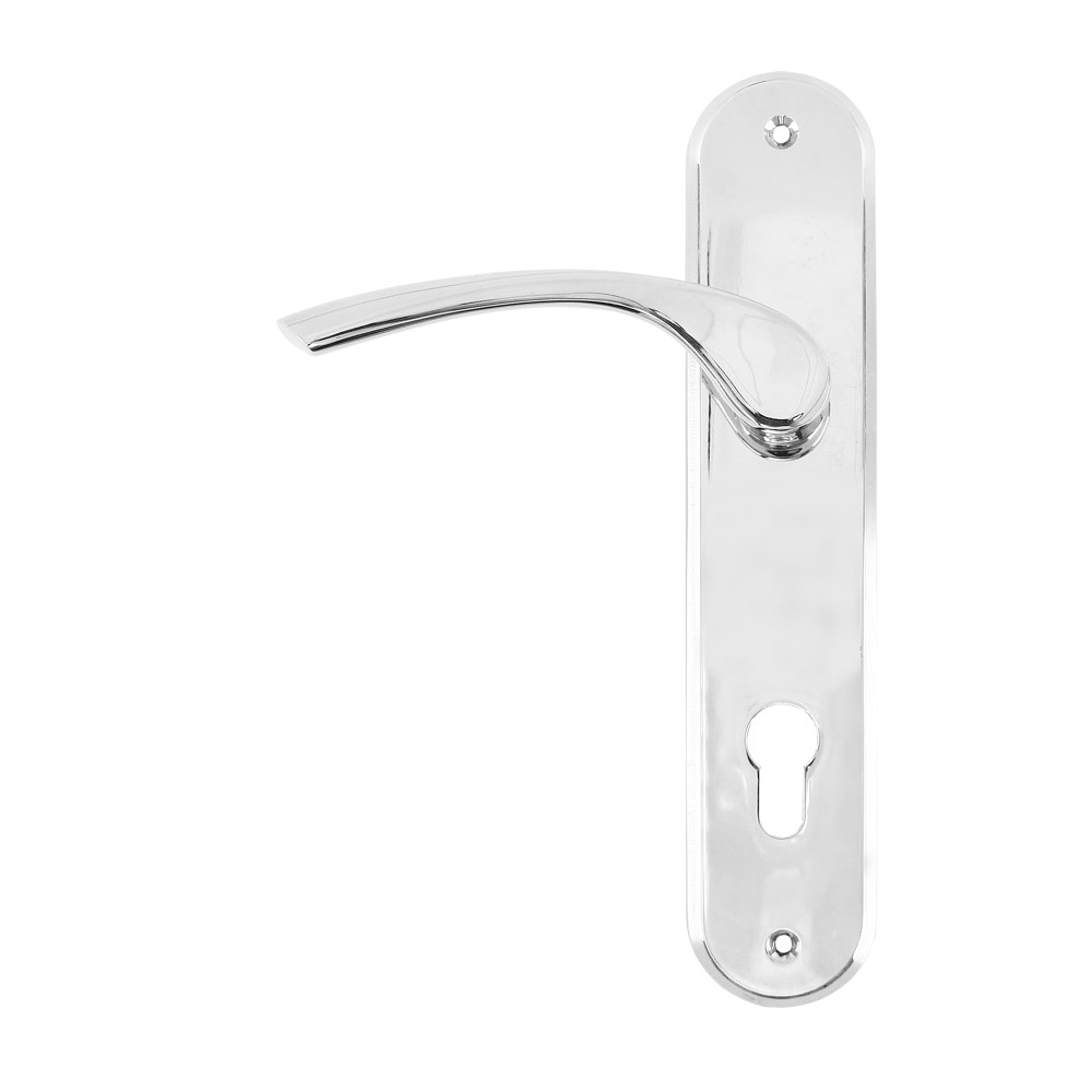This door handle with chrome color.It is a qualitative and resistant handle, her body is composed of solid zinc material, including accessories for instalation.